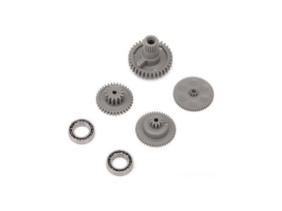 Plastové převody standardního serva Traxxas 2070/2075 pro RC auta a dvojice ložisek. Ozubená kola jsou vyrobena z odolnějšího materiálu a mají optimalizované rozměry pro maximální odolnost.