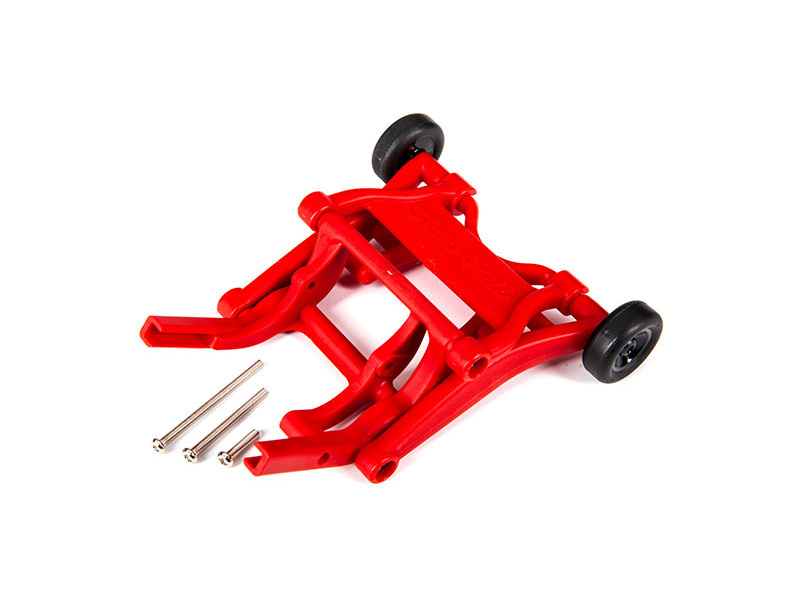 Zadní opěrná kolečka, která brání převrácení auta při přidání plynu v červené barvě pro RC modely aut Traxxas 1:10.