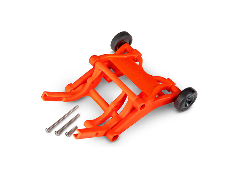 Zadní opěrná kolečka, která brání převrácení auta při přidání plynu v oranžové barvě pro RC modely aut Traxxas 1:10.