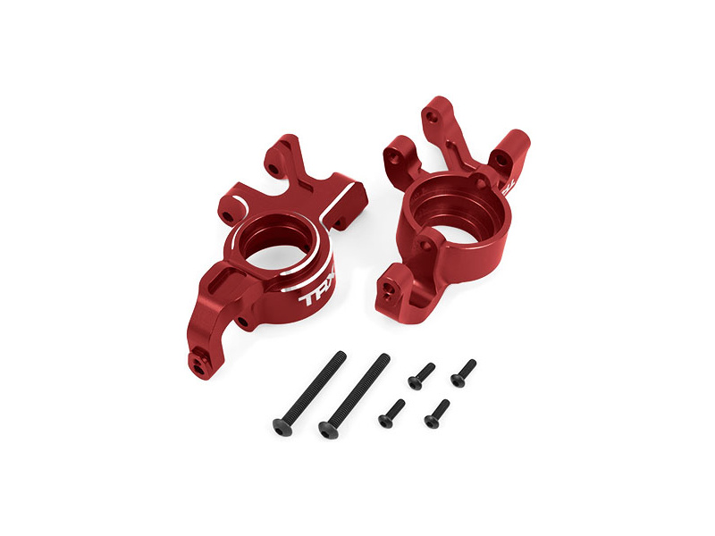Tuningový díl pro RC model auta Traxxas X-Maxx a XRT: těhlice přední hliníková 6061-T6, červený elox (levá a pravá).