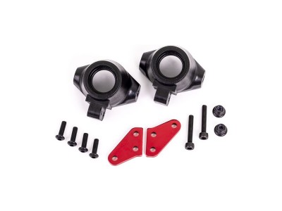 Tunignový díl pro RC model auta Traxxas Sledge. Traxxas těhlice přední hliníková červeně eloxovaná (levá a pravá).