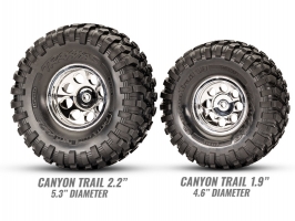 Velké pneumatiky Canyon Trail z extra měkké směsi S1 jsou nalepeny na replice originálních chromovaných kol 2.2" s osmi otvory a krytkou středového náboje. Unašeč kol má 12 mm.