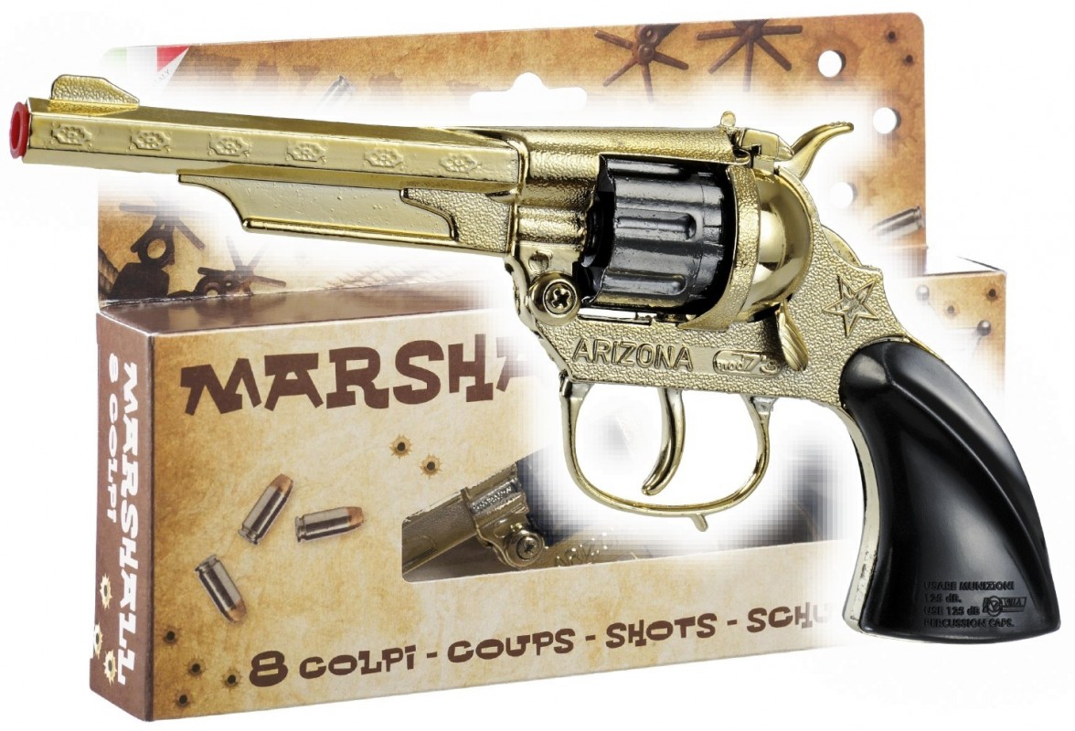 Krásná pistole kovová, 8 ran (pistole na kapslíky, na kapsle) barva zlatá, délka 21 cm. Tato propracovaná pistole, patří mezi oblíbené dětské kapslíkové zbraně. S touto parádou budeš hvězdou každého karnevalu.