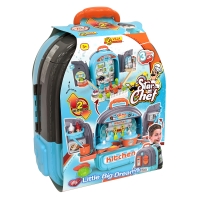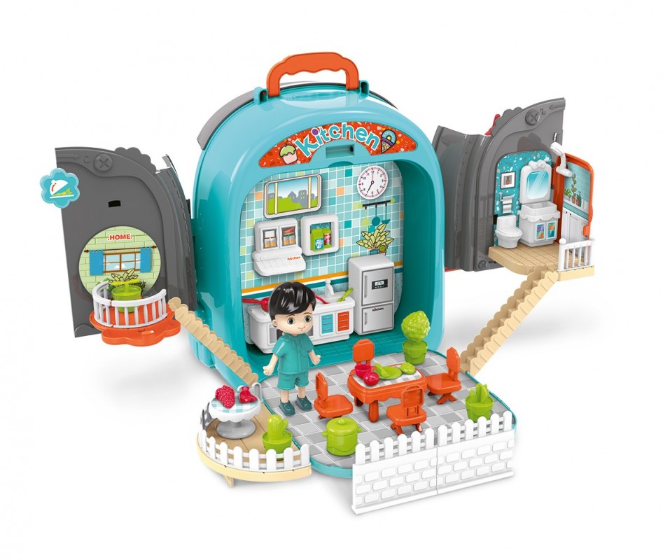 Oboustranný kufřík s kuchyňským koutem a kuchyňským nádobím. Herní sada je ideální pro budoucí kuchtíky. Poslouží jako skvělý dárek ke každé dovolené. Kompaktní model v sobě ukrývá mnoho zajímavých prvků. Na druhé straně je zde menší kopie malého bytu o několika místnostech s postavou osoby a různými interiérovými předměty. Sadu je vhodné vzít s sebou, protože ji lze nosit v rukou za rukojeť. Dítě se může s kuchyní přestěhovat kamkoli v domě.
