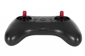 Ovládací prvky: Pro ovládání hlavních funkcí slouží přesné křížové ovladače s nastavitelnou silou neutralizačních pružin a možností přesunutí aretované osy pro plyn vlevo nebo vpravo. Díky tomu můžete libovolně volit provozní módy křížových ovladačů 1-4, ale v příslušenství je vše nezbytné i pro neutralizaci ovladače plynu do středu pro multikoptéry nebo tanky. Digitální trimy mají zvukovou signalizací krokování. Jsou umístěny mírně excentricky a jsou snadno dosažitelné. Další kanály mohou ovládat dva třípolohové kolébkové přepínače, otočný ovladač a tlačítko; přepínače mohou sloužit také pro zapínání/vypínání programových funkcí (po nastavení na PC nebo smartphonu). Ovládací prvky jsou přiřaditelné (na PC nebo smartphonu).